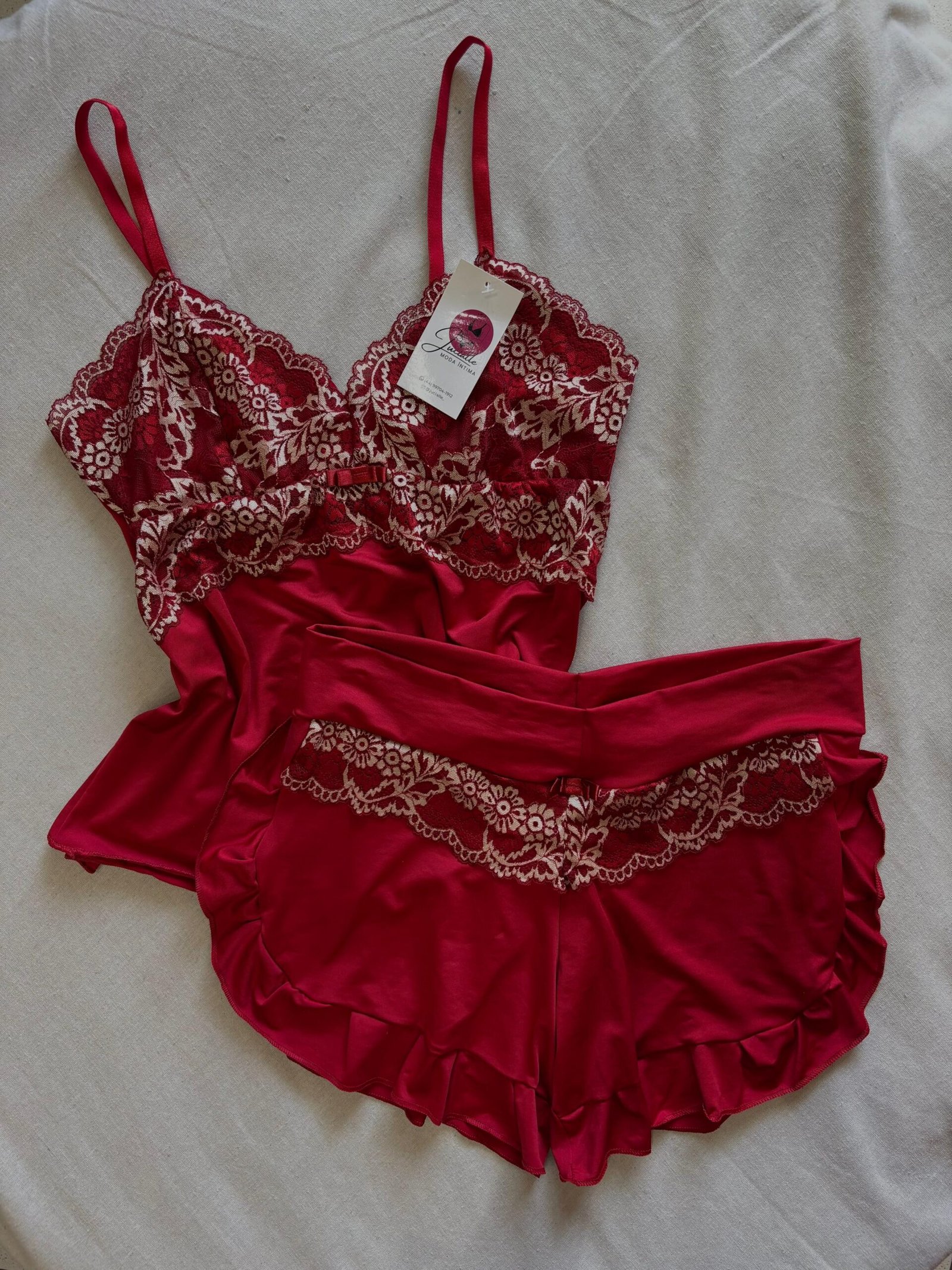 Confeccionado em 90% poliamida e 10% elastano, o tecido oferece toque suave, elasticidade e leveza, proporcionando liberdade de movimentos e sensação de bem-estar durante toda a noite. O busto em renda floral marcante traz sofisticação e sensualidade, enquanto o shortinho com babado adiciona um toque romântico e diferenciado, tornando o conjunto ainda mais especial.