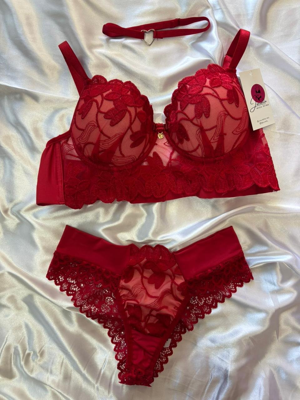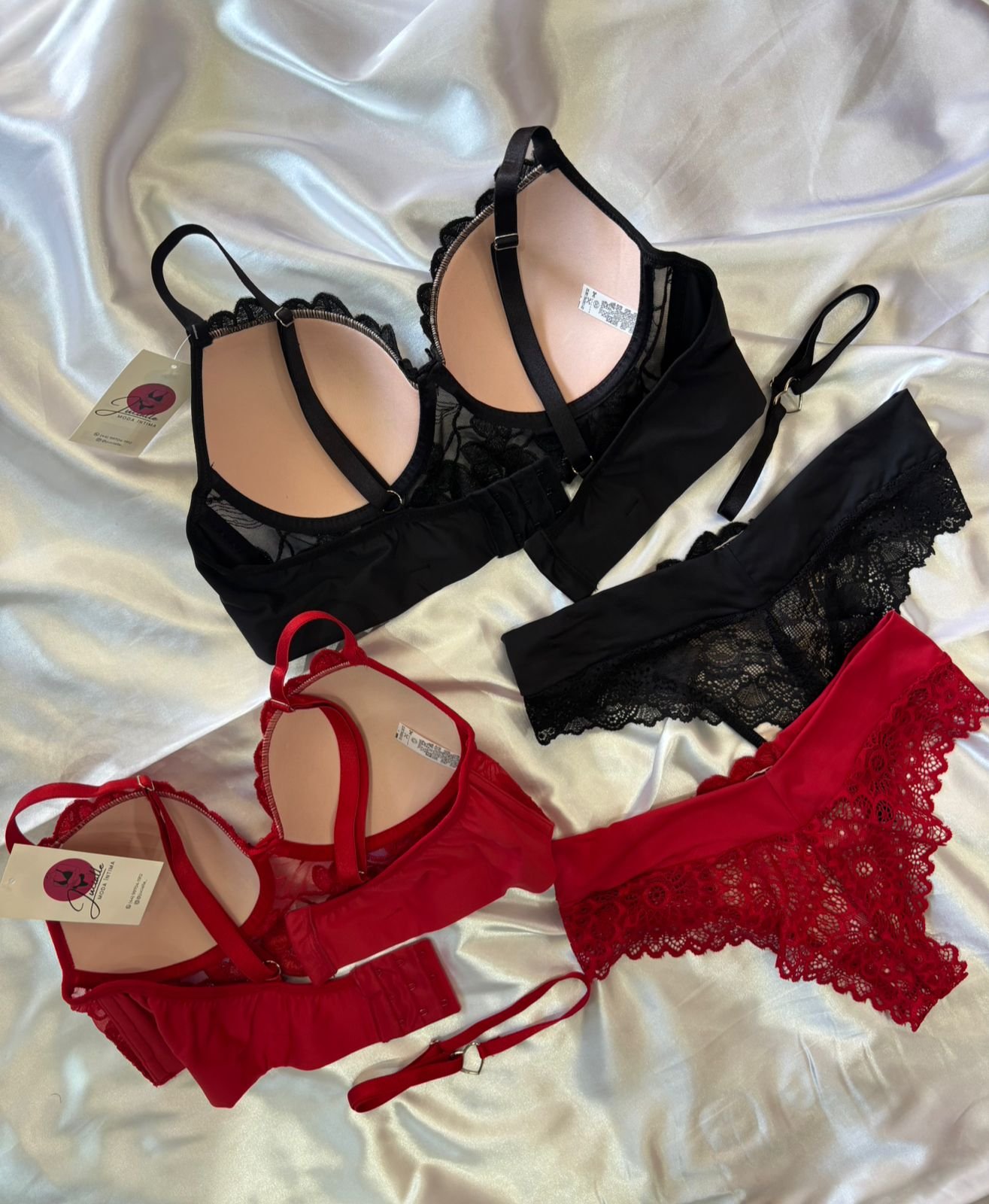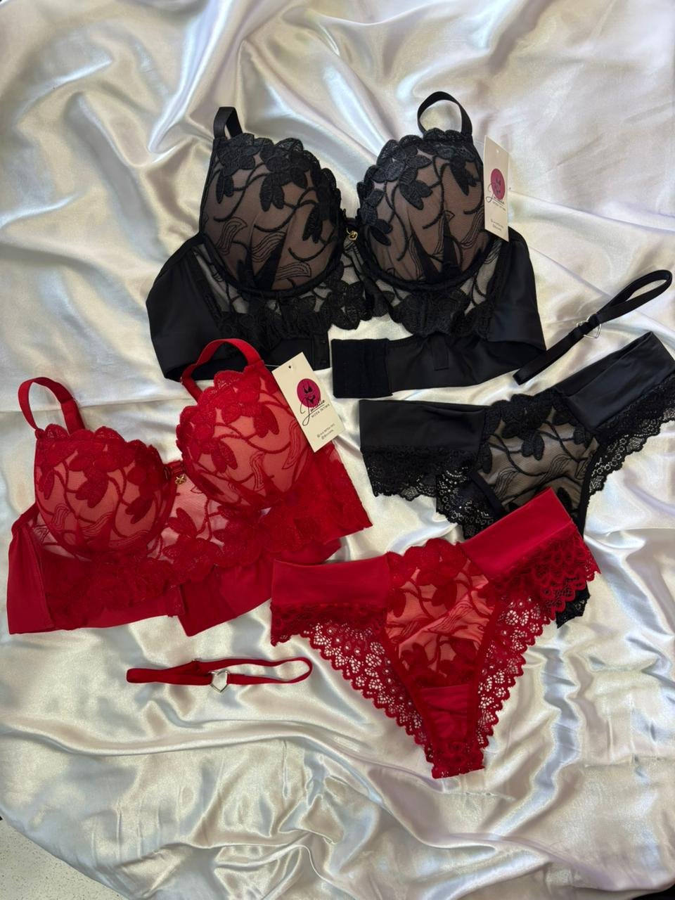 Os detalhes em renda refinada tornam o conjunto sofisticado e irresistível, enquanto as cores clássicas preto e vermelho dão versatilidade para combinar com diferentes estilos.